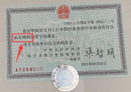 关于三级认证翻译,向来环环相扣,尽管本次”浜本博树“的签名无法辨认,我们还是通过背面的第三级的中国驻日本领事馆的认证上得到他的名字。